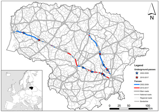 Study area: location of highways A1 and A2 in Lithuania. Also shown are wildlife highway fencing built in 2002–2009 (blue lines) and built in 2010–2017 (red lines), and wildlife underpasses (blue and red stars in 2002–2009 and 2010–2017, respectively).