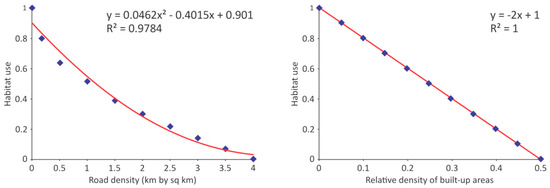 Relationship between red deer habitat utilization and: (a) road density, data after [30]; (b) relative density of built-up areas. Equations are ours.
