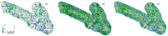 For red deer, we used the Normalized Difference Vegetation Index (NDVI, the most well-known and used index to detect live green plant canopies in multispectral remote sensing data), rescaled from 0 to 1, at 0.01 increments, to map potential riparian movement corridors. We defined them as the portions of 25 m wide buffers along major rivers and creeks that exhibited NDVI values equal to or higher than the median value (0.4) characteristic to meadow/shrub/deciduous vegetation complexes—the ecotypes that are known to provide good hiding cover for red deer [31].