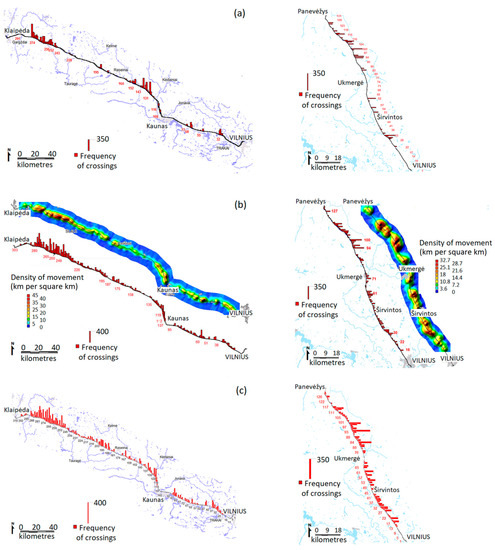 Simulated movements of the three ungulate species across highways A1 and A2 in Lithuania as of 2007: number of crossings of red deer (a) and wild boar (c) per linear km of the highway, and number of crossings and density (km per square km of the habitat) of pathways of roe deer (b).