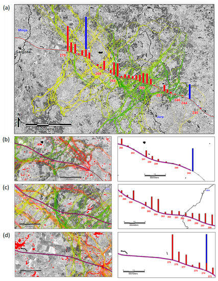 Simulated pathways and crossing frequencies of the red deer in the fenced section of highway A1, showing movement pathways across 240–280 km section with no fencing (a), spillover effect at the end of fence (b), wildlife fence paralleling red deer pathways along the highway (c) and concentrated pathways at the wildlife underpass (d). Bars depict the relative frequency of simulated movement; red bars—no fencing, maximum value 1701 crossings per linear km per year, blue bars—fenced scenario, maximum value 344 crossings per linear km per year. Scale ratio of the blue to red bars is 2.6 to 1. Yellow to green lines depict the ranking (maximum shown = 0.86) of the simulated routes (no fencing scenario), pink lines—the simulated routes of the fenced scenario.
