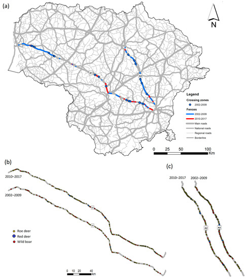 Location of multi-species crossing zones in 2002–2009 (a), ungulate-vehicle collision sites of highways A1 (b) and A2 (c) in 2002–2009 and 2010–2017.