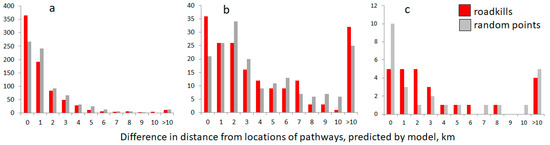 In wild boar and red deer, there were no differences in distance between the model-predicted pathways and the roadkill locations compared to the distance between pathways and random locations (all Wilcoxon test results not significant, alternative hypothesis confirmed). However, the distribution of difference values for wild boar (Figure 7b) was not equal, with the higher share of exact matches of the roadkill (χ2 = 29.5, df = 11, p < 0.002; d = 0.8711, r = 0.3993, ES medium to large). The right wing of distribution with the biggest differences is represented by the extreme ends of the highway A1, >294 km and the A2, >126 km, both being built-up areas.