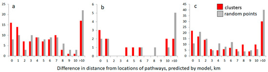 Distribution of distances between model-predicted pathways and the roadkill locations compared to distances between pathways and random locations for roe deer (a), wild boar (b) and red deer (c).