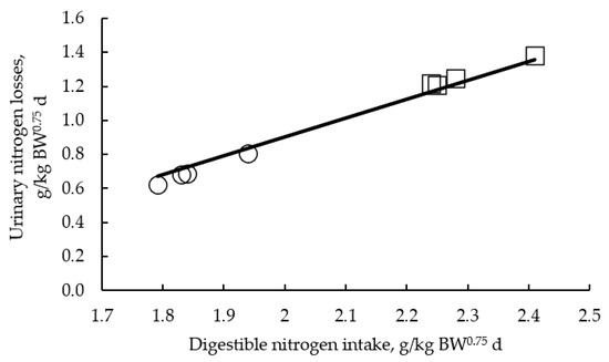 Relationship between digestible nitrogen intake and urinary nitrogen losses during fattening in rabbits (Urinary nitrogen losses = −1.31(±0.13) + 1.11(±0.061) digestible nitrogen intake; N = 8; p < 0.001. Original observations plotted with the mean regression line across studies: ○ Delgado et al., 2018. □ Current study).