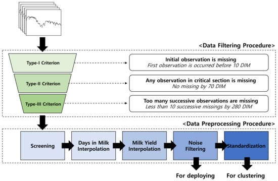 The milking records from 10 to 280 days-in-milk (DIM; calving day was considered as 0 DIM) were used. This was because the data before 10 DIM and after 280 DIM were error-prone due to differences in management practices among the four farms. In addition, an ideal LC is formed using a concave function and the peak is often achieved within 10 weeks [37]. Because the peak information is critical source of information in LCs, we set the non-interpolation period within the 10 through 70 DIM. Lactation records were preprocessed according to three criteria for incomplete data (Figure 1).