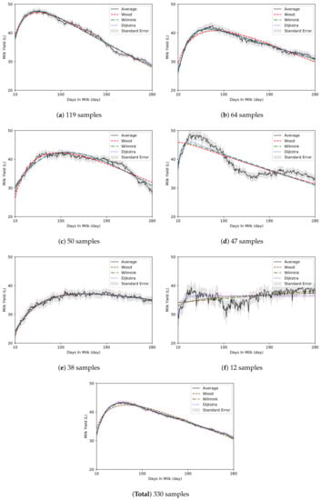 The best fitting models are not the same in each clusters as shown in Table 5. The results are consistent with the those of previous studies [3,19]. Previous studies performed goodness of fit tests of the LC model for lactation data by grouping the data according to the period in which the milking data was obtained, the level of milk production, and parity, with the aim of finding a model that optimally describes lactation. Direct comparison on fitting accuracy of presented method to the previous studies is somewhat difficult to perform, since data collection duration, number of cows breed, metric of average milk yield and the data grouping method were not unified among the previous studies. The LC models in previous studies [3,19] were established from the selected groups considering ability of milk production and parity from a large breeding group. Abnormal populations were not considered for the LC model and excluded as exceptional cases. The previous approaches are not appropriate for studying the atypical cases of LC. The LC characteristics of atypical cases would be taken into account using the clustering method.