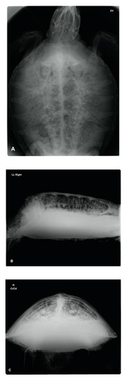 11]. For these reasons, our results suggest that the systematic association of clinical and radiographic examinations can enhance the diagnostic procedures. Radiographic examination is considered the gold standard for screening sea turtles that show respiratory signs or abnormal buoyancy. Our experience confirmed that the slow respiratory rate of reptiles, associated with the lung–air contrast, allowed the lungs to be visualized in detail, suggesting that this might be a technique suitable for diagnosing a pulmonary disease. Out of 14 turtles evaluated, 4 had pneumocoelom.