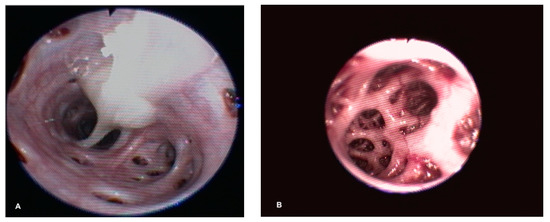 Rotation of the endoscope by 30–45° either direction allowed passage through the bronchus into the lung. BAL was always performed after endoscopic procedures. Sterile 0.9% (NaCl) saline solution (2–3 mL/kg) was applied through a sterile syringe via the endoscope’s irrigation channel and immediately re-collected. The resulting sample was analyzed cytologically and microbiologically.