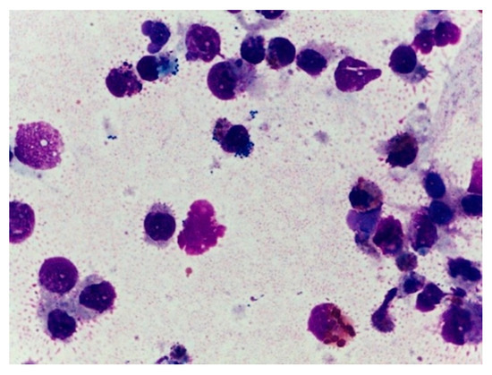 5], erythrocytes and bacteria are considered pathological findings, and numerous histiocytes and heterophils suggest an inflammatory infectious process even in the absence of bacteria or fungi. In 85% (12/14) of the cytological samples, the atypical finding of an inflammatory population of heterophil cariolitic granulocytes in phagocytosis, cocciform and bacilli-like bacterial microorganisms, scattered on the bottom, was compatible with a polymicrobial septic heterophilic inflammation, sometimes suppurative or with aspects of chronicity.
