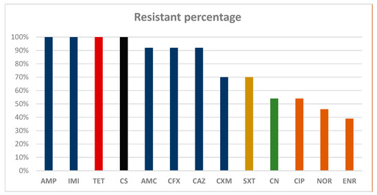The isolates exhibited resistance percentages higher than 70% against all the beta-lactam molecules tested. In particular, 100% of the strains tested as resistant against ampicillin and imipenem, and 92% tested as resistant against amoxicillin + clavulanic acid, cephalexin and ceftazidime. Seventy percent of the strains were found to be resistant against cefuroxime. Moreover, 100% resistance was also reported against tetracycline and colistin sulfate, as shown in