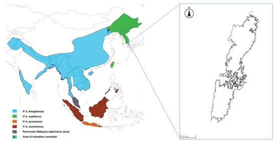 - Tamada, T.; Siriaroonrat, B.; Subramaniam, V.; Hamachi, M.; Lin, L.K.; Oshida, T.; Rerkamnuaychoke, W.; Masuda, R. Molecular diversity and phylogeography of the Asian leopard cat, Felis bengalensis, inferred from mitochondrial and Y-chromosomal DNA sequences. Zool. Sci. 2008, 25, 154–163. [Google Scholar] [CrossRef] [PubMed]