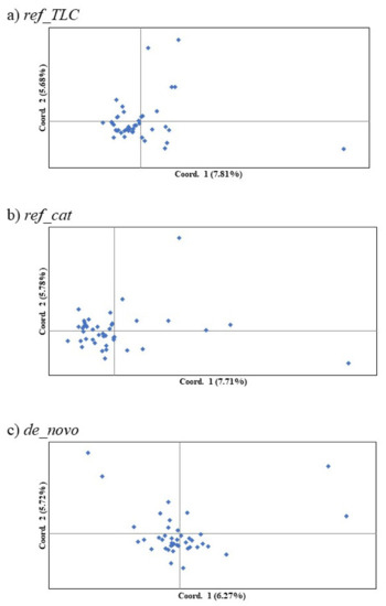 First and second components of principal coordinate analysis of SNP markers in the Tsushima leopard cat for three methods: (a) ref_TLC, (b) ref_cat, and (c) de_novo. Parentheses denote the percentages of variation explained.