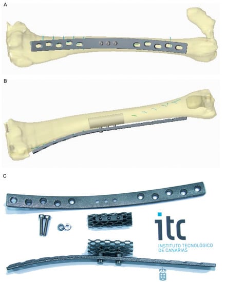 Osteosynthesis plates were custom-designed from dicom files obtained through a CT study performed in advance to the tibia of the sheep used in the study. The goal of customization was to be able to adapt the metal plates to the medial profile of the tibia without intraoperative modification (Figure 1A,B). They consisted of neutralizing low-contact plates with holes to fit the screws that would anchor to the bone and two smaller holes where smaller screws anchored to the metal scaffold (Figure 1).