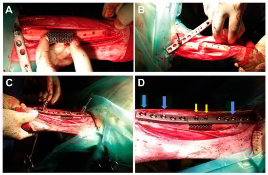 Photographs illustrating the surgical implantation of a titanium scaffold (experimental group). (A) The tibia has been exposed, and the scaffold is shown next to it. (B) A five-centimeter full-thickness defect has been practiced. (C) The scaffold has been placed on the defect, and the tibia is being stabilized with a custom-made osteosynthesis plate. (D) Final result, showing the scaffold and osteosynthesis plate, which is held in place by screws that anchor in the bone (blue arrows) or in the scaffold itself (yellow arrows). In the CONTROL group, the surgical procedure was similar, but the defect was filled with hydroxyapatite.