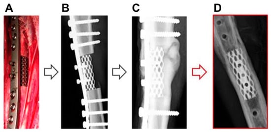 The reconstruction of large bone defects has traditionally been achieved by the use of resorbable bone substitutes [,] or permanent metallic prosthetic implants [,,]. Unlike bone substitutes, which cannot hold the load bearing, metal prosthetic implants allow early functional recovery. Postoperative success in the mid- and long-term depends on two critical factors: load-bearing capacity and osseous integration. Our results showed that traditional metal implants fail in the early stage of the treatment because of the inability to ensure the load bearing. Indeed, critical defects can lead to failure if adequate implant support techniques are not used, such as an orthogonal second plate, external fixators, blocked nails, or bandages or suspensions, and, in any case, subtraction from the load [,,,,,]. This aspect was empathized in our large animal model, which was aimed to stress also the aspect of the load bearing. Hydroxyapatite is known to be osteoconductive [], but in our case, we think that the failure of the implant was related to the poor load-bearing ability of the scaffold. Moreover, previous publications proved also that traditional implants tend to fail also in the medium and long-term due to poor osteointegration—because they are solid, bones cannot grow inside them, and a structural connection between the metal and bone is not formed. Some manufacturers have incorporated porous surfaces in some elements of their prostheses in order to amend this problem [].
