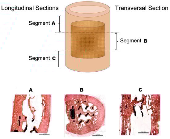 Histological processing of the sheep tibiae from the experimental group. Upper panel: Each bone, containing the implant, was sectioned into three segments. Longitudinal sections were obtained from the ends (segments A and C), while the central part was cut transversally (segment B). Lower panel: Panoramic overview of the von Kossa-stained methyl-methacrylate sections. (A,C) are longitudinal sections. (B) is a transversal section. The bone is stained in brown, and the titanium of the scaffold appears black in color. Note how the bone trabeculae are connecting the metal bars that compose the porous titanium scaffold.