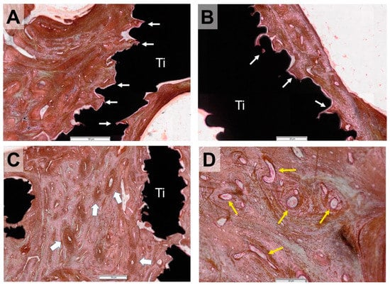 There was direct contact between this newly formed bone and the titanium trabeculae, with no soft or fibrillar tissue between the metal and the bone. Indeed, the bone tissue profile closely matched that of the titanium (Figure 6A,D) due to bone growth in all the interstices of the titanium surface.