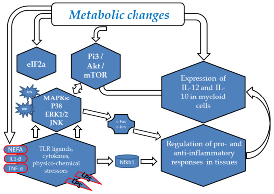 Metabolic stress is perceived by the innate immune system. The Pi3/Akt/mTOR- and eIF2α-dependent signal transduction cascades are the main signaling pathways monitoring nutrient availability and controlling metabolic stress responses. Toll-like receptors (TLRs) are expressed on innate immune cells, such as neutrophils, macrophages, and dendritic cells, and respond to the membrane components of Gram-positive or Gram-negative bacteria and to saturated free fatty acids mainly included in the NEFA (Non-esterified Fatty Acid) that are released by adipose tissue during status of negative energy balance. TLRs provoke rapid activation of innate immunity by inducing production of proinflammatory cytokines and upregulation of costimulatory molecules by both MAPK activation, which in turn activates c-Fos and c-Jun, and NF-kappa B activation through a MyD88-independent pathway. In addition, interleukin-1β (IL1-β) and tumor necrosis factor alpha (TNF-α), as critical cytokines, can induce a wide range of intracellular signal pathways as well as inflammation and immunity as nearly all cells express the respective receptors.