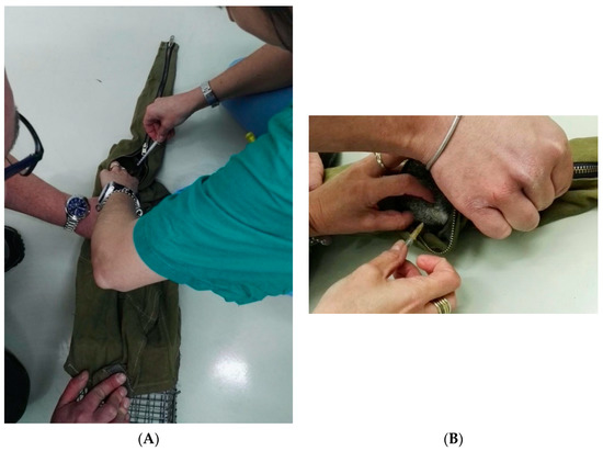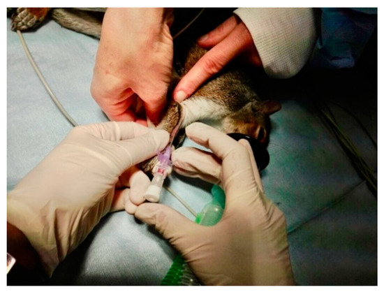 When safe handling was possible, animals were removed from the capture-sleeve and connected through a facemask to a Jackson-Rees non-rebreathing circuit. The oxygen flow was set at 300–500 mL/kg/min. If an inadequate level of anesthesia was noted during surgery, sevoflurane (SevoFlo®, Zoetis Italia S.r.l., Milano, MI, Italy) was administered to effect. Squirrels were placed on the surgical table on a temperature-regulated heating pad; their chest and upper limbs were further draped with bubble wrap packaging material to limit hypothermia. An attempt to aseptically catheterize a cephalic vein (Delta Ven® 26 G, Delta Med S.p.A., Viadana, MN, Italy) was always made after clipping and scrubbing of the area and skin cut down, and was recorded for each animal, regardless of the outcome (Figure 3).
