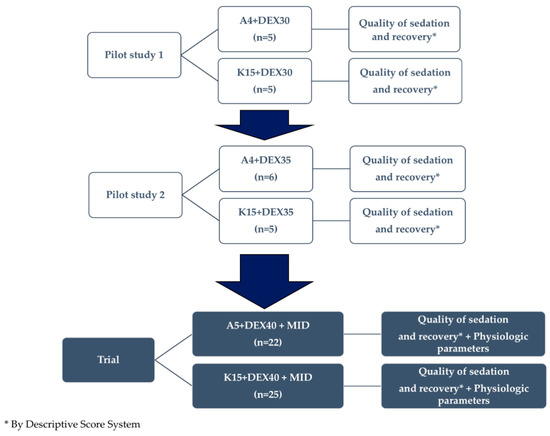 Experimental protocol that includes the two pilot studies. A4 = alfaxalone 4 mg/kg; DEX30 = dexmedetomidine 30 µg/kg; DEX35 = dexmedetomidine 35 µg/kg; K15 = ketamine 15 mg/kg; A5 = alfaxalone 5 µg/kg; DEX40 = dexmedetomidine 40 µg/kg; MID = midazolam.