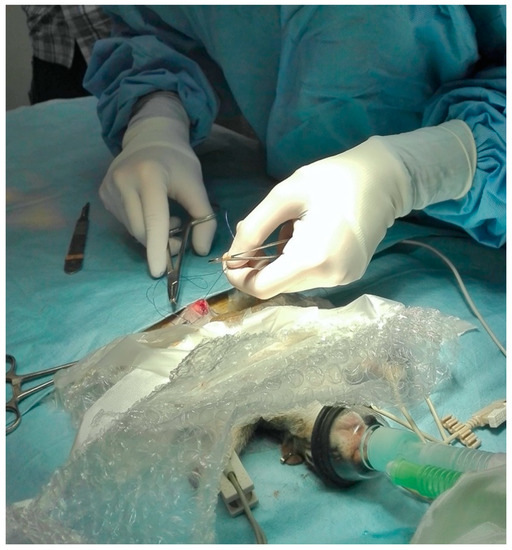 The laparotomic surgical access was sutured in three-layers and an intradermal suture pattern was performed (3/0 PDX, vetSuture®, Noévia S.A.S., Paris, France) in all animals (Figure 5), which was infiltrated with 4 mg/kg lidocaine (Lidocaina 2%®, ESTEVE S.p.A., Milan, MI, Italy) to provide local analgesia. At the end of surgery, 200 µg/kg atipamezole (Atipam®, Dechra Veterinary Products S.r.l., Turin, TO, Italy) and 1 mg/kg meloxicam (Metacam 2%®, Boehringer Ingelheim Italia S.p.A, Milan, MI, Italy) were administered IM.