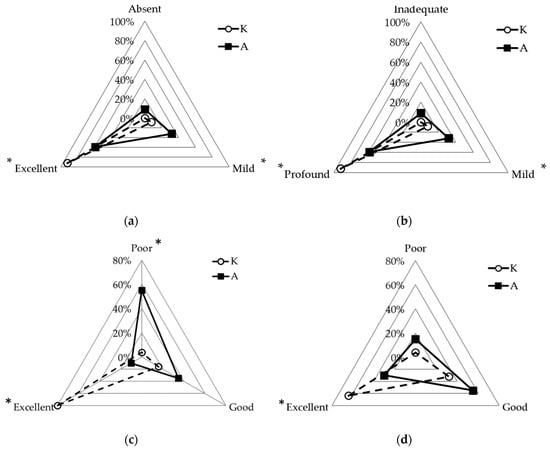 Radar charts for muscle relaxation (a), depth of anesthesia (b), recovery time (c), and quality (d) for wild gray squirrels undergoing gonadectomy, randomized to receive two anesthetic mixtures IM: Ketamine-dexmedetomidine-midazolam (group K, n = 25) and alfaxalone-dexmedetomidine-midazolam (group A, n = 22). Asterisks indicate the levels of each variable in which the differences between groups were significant at the 0.05 level.