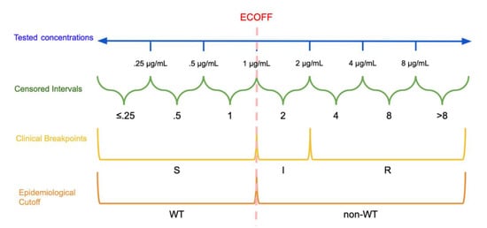 The other predominant categorization method involves the establishment of clinical breakpoints. This process partitions MIC values into distinct classes of bacterial susceptibility based on clinical outcomes. CSLI defines these classes as “susceptible” (S), “resistant” (R), and either “intermediate” (I) or “susceptible-dose dependent” (SDD) []. Note that EUCAST defines its intermediate breakpoint as “susceptible, increased exposure” (I) []. See Figure 1 for a visual comparison of MIC concentrations, censored MIC intervals, clinical breakpoints, and epidemiological cutoffs. [,]. These breakpoints are established by organizations such as the CLSI, EUCAST, and the U.S. Food and Drug Administration Center for Drug Evaluation and Research []. Different organizations use different names and definitions for intermediate classes that allow for some ambiguity in interpretation and specific information on these categories is typically available on each organization’s website [,]. Classifications based on an ECOFF are not immediately related to classifications based on clinical breakpoints, an isolate identified as non-WT will not necessarily be clinically resistant, instead it may still be clinically susceptible [].