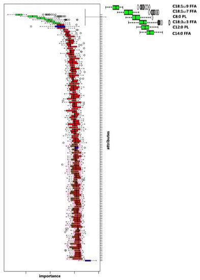 Box plot of Boruta decisional algorithm and detail of the green box plot with nomenclature of the main predictive fatty acids (FAs). Green box plot represented the fatty acid with the greatest predictive function. Red box plot represented the FAs with null predictive function.