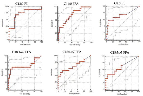 Table 4 presents the data of the five FA selected on the basis of the 0.70 threshold. C18:3 ω 3 showed an AUC lower than 0.70 and was therefore eliminated.