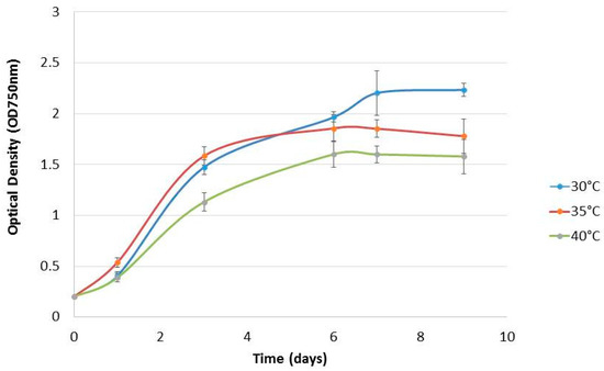 For the study of the thermotolerance capacity, Chlorella sp. QUCCCM3 was scaled up gradually, as previously described (Section 2.2), to 1 L in bioreactors (DASGIP parallel bioreactor system, Eppendorf Inc., Ocala, FL, USA), with an initial OD750nm of 0.2. The strain was subjected to four culture temperatures, nameley 30, 35, 40, and 45 °C, with a mixing set to 200 rpm, using a pitch blade impeller. The illumination was provided by 3 internal DASGIP LED sticks having 3 channel emission spectrum (channel A, 660,780 nm; channel B, 572,625,640 nm; channel C, 453 nm). Set points were 2.00, 1.244, and 2.00 μmol photons·s−1 for channels A, B, and C, respectively, fixed for a photon flux density of approximately 200 µmol photons m−2 s−1, which is considered to be optimum for the standard cultivation of microalgae, at 12 h:12 h dark:light cycles. A daily assessment of the OD750nm was performed to be able to compare the growth performance of the strain under the different temperatures tested.