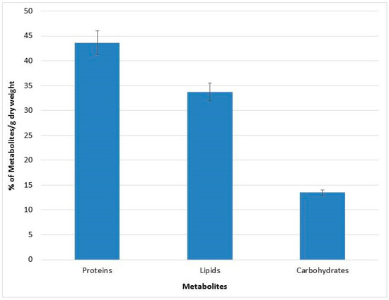 An assessment of the metabolites content was performed for QUCCCM3, to investigate its nutritional potential. The biomass obtained at 30 °C was subjected to quantitative and qualitative metabolite analysis. Results showed that Chlorella sp. QUCCCM3 presented a high amount of proteins, reaching up to 43 ± 2.3%, whereas the lipid amount was found to be 33 ± 1.75%. Additionally, the carbohydrates estimated was up to 13.5 ± 0.5%, as illustrated in Figure 2. Such results highlight the potential of our local isolate as a novel source of proteins and lipids.