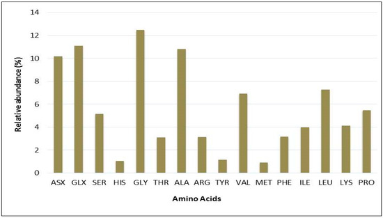 To support these findings, the quality of proteins in Chlorella sp. QUCCCM3 was analyzed through amino acid profiling. The obtained data are illustrated in Figure 3 and confirmed the presence of the nine essential amino acids with different concentrations. Glycine was the most abundant essential amino acid, accounting for almost 14% of total protein. It also showed the presence of 12% GLX (representing both glutamate and glutamine, glutamate being precursor to L-glutamic acid). Leucine was present in concentrations up to 8%, and lysine, an important amino acid, was found to be 5% of the total proteins. The lowest concentrations of amino acids were found for histidine, tyrosine, tryptophan, and methionine.