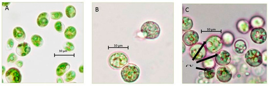 Morphological characterization of the Chlorella sp. QUCCCM3. Strains were cultivated under (A) control condition; (B) 40 °C; and (C) continuous light at 100× magnification, using light microscopy (Primo star HAL microscope, full Kohler, Carl Zeiss, Germany); CV: carotenoids vesicle.