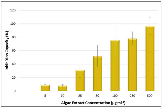 Inhibition capacity of the Chlorella sp. QUCCCM3 extract, using MTT assay against leukemia cancer cell line K562 after 24 h of incubation. Extracts used with concentrations of 5, 10, 25, 50, 100, 250, and 500 μg mL−1. Absorbance was measured at 540 nm, using the automated Microplate Spectrophotometer (Biotek). The blank-corrected absorbance of the control wells was taken as 100%, and the results were expressed as a percentage of the control. All data were recorded in triplicate, n = 3.