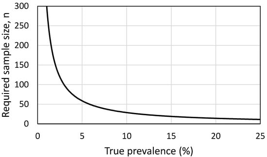 The sample size (=number of slugs) required to detect at least one infected slug, given true prevalence from 1% (n = 299) to 25% (n = 11). Higher prevalence omitted for clarity: n declines further to 5 (at 50% prevalence) and 3 (75%).