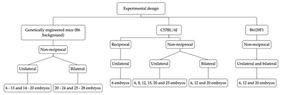 This work includes 3 sets of experiments (summarized in Figure 1) one set involving historical data of genetically engineered mice at a C57BL/6J background, using unilateral and bilateral non-reciprocal embryo transfers; a second set of prospective experiments involving reciprocal and non-reciprocal unilateral and bilateral transfers with C57BL/6J wild-type mice; a third group of prospective experiments involving non-reciprocal unilateral and bilateral transfers with B6129F1 wild-type mice. The choice for the number of embryos tested in the bilateral condition was based on the results of the unilateral transfer.