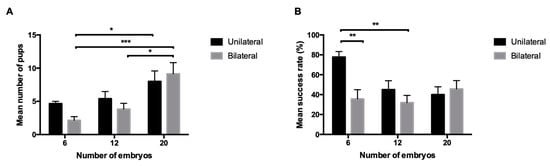 (A) Mean number of pups after unilateral and bilateral transfers using 6, 12 and 20 C57BL/6J embryos. Statistically significant differences were found between 6 embryos unilateral group and 6 and 12 embryos bilateral; (B) success rates for unilateral and bilateral transfers using 6, 12 and 20 embryos. Statistically significant differences were found between 6 embryos bilateral and 20 embryos unilateral and bilateral and between 12 and 20 embryos bilateral. Values are mean ± SEM. * p < 0.05, ** p < 0.01, *** p < 0.001.