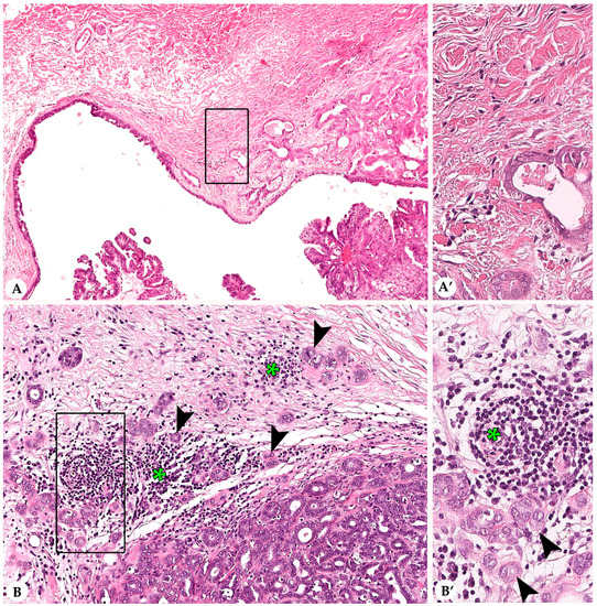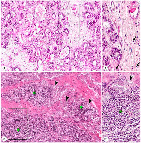 Stromal tumor infiltrating lymphocytes (TILs) within the infiltrative margin (IM) of pet rabbit mammary carcinomas. Shown are two representative tumors with nearly complete absence of stromal TILs (A,A’) and multifocal clusters of stromal TILs (B,B’) at the IM, respectively. (A,A’) Grade II carcinoma with tubular and cystic growth patterns and mild secretory activity. The IM contains no unequivocal stromal TILs. In A, the 10× objective field of view (FOV) is depicted. The rectangle in A delineates the area that is shown in A’ in higher magnification. (B,B’) Grade II carcinoma with a predominantly tubular growth. TILs (green asterisks) are mostly located between and adjacent to the infiltrative tumor cell nests (arrowheads). In B, the 20× objective FOV is shown and contains approximately 25% stromal TILs. The area that is contained within the rectangle is depicted in B’ in close up.
