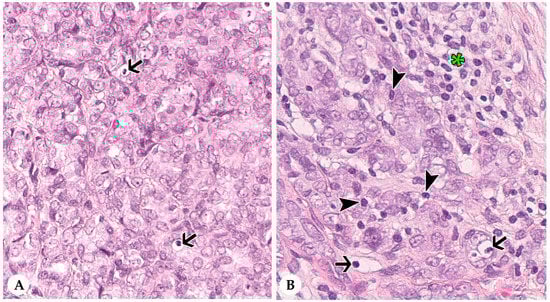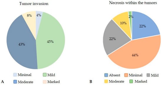 Histological parameters extracted from the databases were the tumor area with a tubular growth pattern in percent of the entire tumor area, the mitotic count per ten 40× high power fields (HPFs) under consideration of the field number of the microscope, the degree of nuclear pleomorphism, as well as the degree of tumor invasion [,,]. The results of the former three parameters were used to determine the histological tumor grade [,,]. Depending on the degree of tissue infiltration, tumors were classified as those with mild, moderate, or marked invasive behavior [,,]. Necrosis was recorded as minimal, mild, moderate, and marked, if it affected <10%, 10–39%, 40–69%, and ≥70% of the tumor area, respectively [].