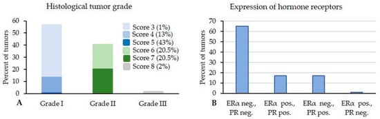 (A) Of the 107 rabbit mammary carcinomas, 57% were grade I, 41% grade II, and 2% grade III. (B) The majority (65%) was hormone receptor negative, whereas 17% of the tumors expressed both receptors, 17% showed immunostaining for solely progesterone receptor, and 1% was immunoreactive for only estrogen receptor. ERα = estrogen receptor; PR = progesterone receptor.