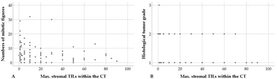 Higher maximal (max.) stromal tumor infiltrating lymphocytes (TILs) per 20× objective field of view (FOV) within the central tumor (CT) are statistically correlated with decreased numbers of mitotic figures per ten 40× HPFs (A) and a lower histological tumor grade (B).