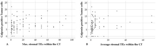 An increased percentage of calponin positive tumor cells is statistically correlated with higher maximal (max.) stromal tumor infiltrating lymphocytes (TILs) per 20× objective FOV within the central tumor (CT), (A) and higher average stromal TILs within the central tumor (B).