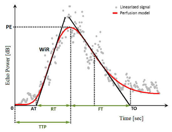 Examples of time–intensity curve explaining how peak enhancement (PE), wash-in rate (WiR), arrival time (AT), rising time (RT), time to peak (TTP), falling time (FT) and time to fall (TO) were calculated.