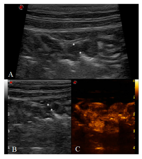 Cat affected by gastric low-grade lymphoma (LGAL) showing: (A) diffuse reduced layer definition associated with mild increases in wall thickness (3.8 mm between the asterisks) on B-mode examination; (B,C) B-mode (B) and contrast-enhanced ultrasonography (CEUS) (C) clip acquired using dual-mode visualization in order to better identify the gastric wall during CEUS examination.
