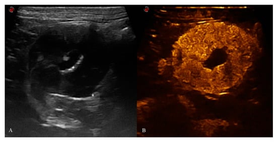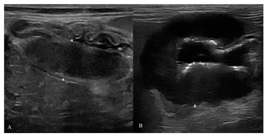Feline gastric high-grade lymphoma (HGAL): (A) B-mode image of a severe and diffuse hypoechoic wall thickening of 18 mm (between the asterisks) with complete loss of normal wall layers; (B) CEUS examination of the same cat during the peak enhancement of time–intensity curve.