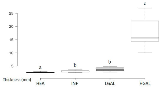 The values and summary statistics of B-mode US measured gastric wall thickness with cytopathological classification are reported in Figure 4 and Table 1. The wall thickness in HGAL was significantly higher (<0.001) than the other groups, specifically 6.7 times the thickness of HEA, 5.5 times the thickness of INF, and 4.6 times the thickness of gastric walls affected by LGAL. Other statistical differences in thickness were found between HEA and INF (p = 0.021) and between HEA and LGAL (p = 0.028). No statistically significant difference was found between INF and LGAL (p = 0.074) in wall thickness.