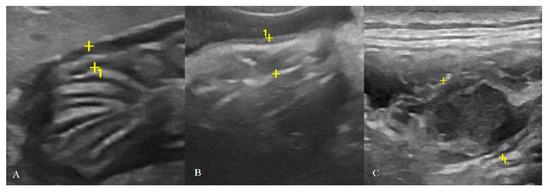 B-mode US qualitative and quantitative characteristics of normal and pathological gastric walls have been reported in the veterinary literature throughout the years both in dogs and cats [1,10,11,38,39]. In our study, the average gastric interrugal thickness in healthy cats (mean 2.6 mm) was similar to that reported in the literature (around 2 mm) [1,40]. Focal or diffuse wall thickening with various echogenicity, associated with a loss of layer definition, are the main signs of HGAL [5,6,7,8,10,41,42]. However, LGAL is reported to have a similar B-mode US appearance to that of GI inflammatory diseases, causing no alteration or diffuse/multifocal mild wall thickening with lost/reduced/preserved layer definition and mesenteric lymphadenopathy [5,11,12,38].