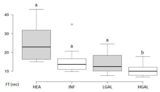 Box and whisker plot of the falling time (FT) for healthy (HEA), inflammatory (INF), low-grade alimentary lymphoma (LGAL) and high-grade alimentary lymphoma (HGAL). a,b Values with different superscript letters differ significantly (p < 0.05).