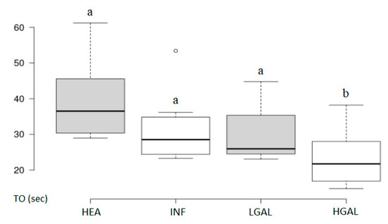 Box and whisker plot of the time to fall (TO) for healthy (HEA), inflammatory (INF), low-grade alimentary lymphoma (LGAL) and high-grade alimentary lymphoma (HGAL). a,b Values with different superscript letters differ significantly (p < 0.05).